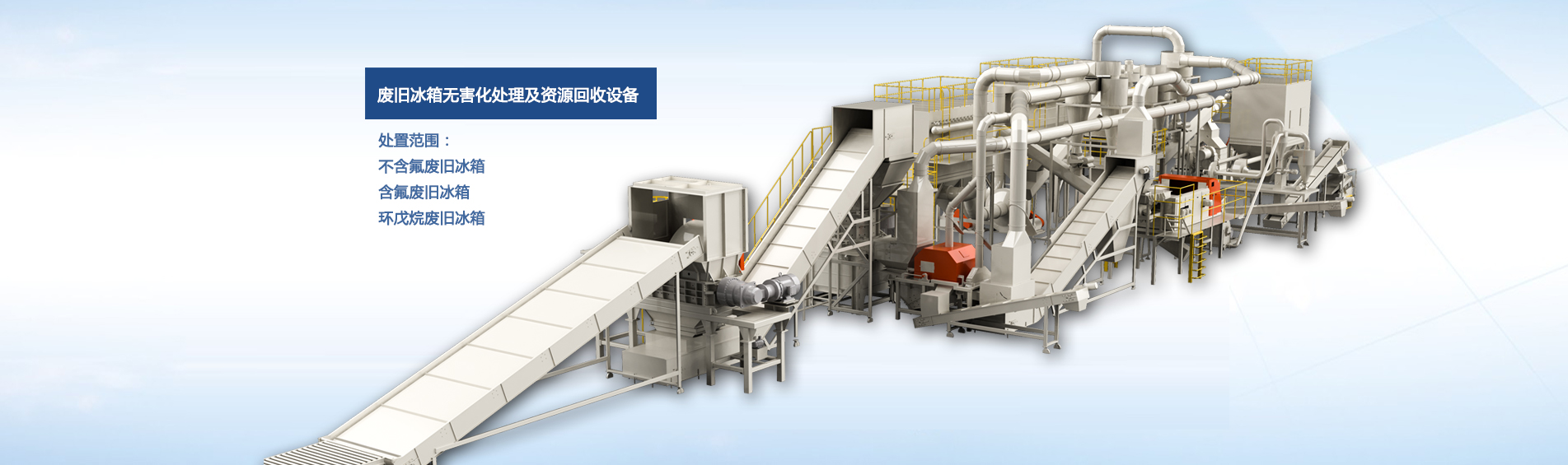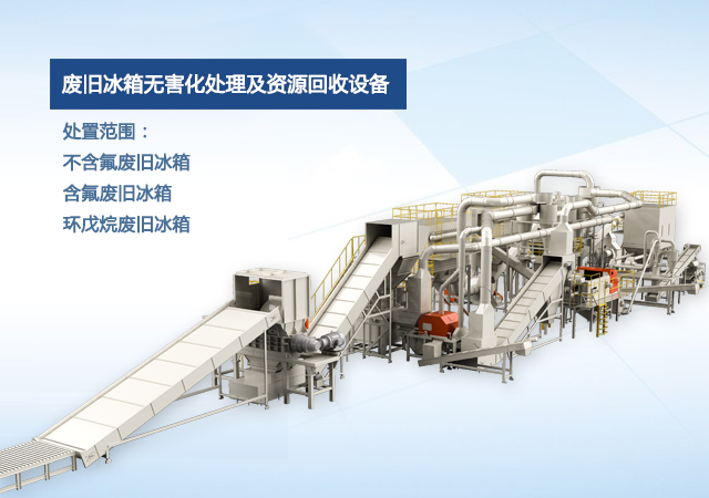 公司自主研发的废旧冰箱无害化处理及资源回收技术及设备, 独具 “双轴撕碎机+立式破碎机+大风量稀释环戊烷气体”的专利组合设计, 主要用于对废旧冰箱中的各种原材料进行分离、 回收和利用, 具有自主知识产权, 经国家工业和信息化部科技成果鉴定为 “填补国内空白, 达到国际先进水平” 。