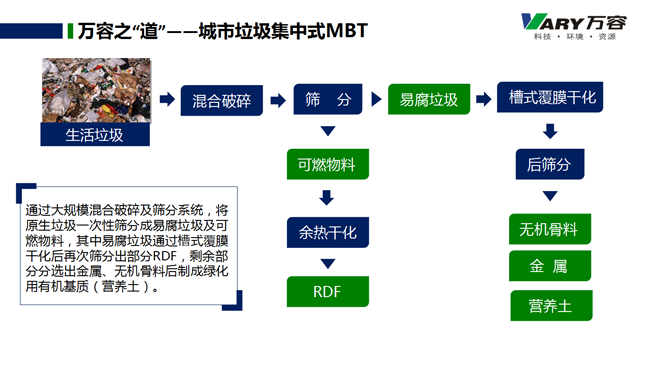 城市垃圾集中式MBT通过大规模混合破碎及筛分系统,将原生垃圾一次性筛分成易腐垃圾及可燃物料,其中易腐垃圾通过槽式覆膜干化后再次筛分出部分RDF,剩余部分分选出金属、无机骨料后制成绿化用有机基质(营养土)。