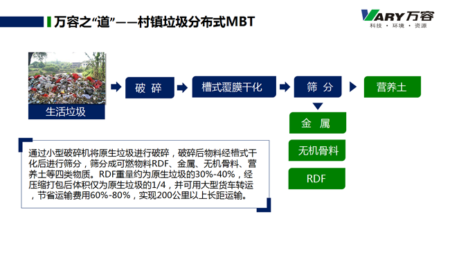 村镇垃圾分布式MBT则是通过小型破碎机将原生垃圾进行破碎,破碎后物料经槽式覆膜干化后进行筛分,筛分成可燃物料RDF、金属、无机骨料、营养土等四类物质。明果英表示,RDF重量约为原生垃圾的30%-40%,经压缩打包后体积仅为原生垃圾的1/4,并可用大型货车转运,节省运输费用60%-80%,实现200公里以上长距运输。