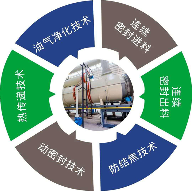 ■资源利用率高---重点攻克了连续密封进料、连续密封出料、防结焦技术、热传递技术、冷凝收油技术,占地量小,处理时间短,主要产出物热解碳、热解油、热解气可回收利用,资源利用率高;