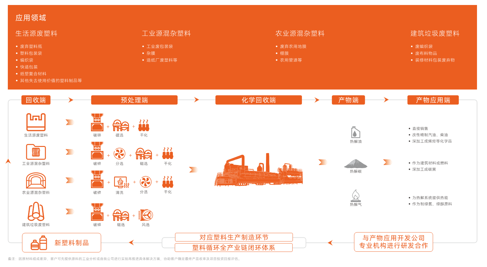 采用无氧热解技术,实现废轮胎、塑料的物理化学回收,解决困扰世界难题的“白色污染”及“黑色污染”。针对废轮胎提供破碎分选设备、前端预处理及终端热解、废轮胎综合利用整厂系统服务。在安全、环保、连续稳定运行的前提下,废轮胎(废旧橡胶制品)最终转化为钢丝、热解油、热解碳,实现资源化、无害化、减量化处置。包装废塑料、分拣后城市垃圾、工业废塑料、农膜、纸厂垃圾等无法再进行直接利用,经破碎、分选、无氧热解后,最终转化为高热值的能源化产品热解油、热解碳,实现资源化、无害化、减量化处置。